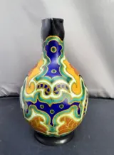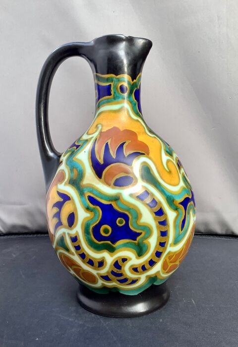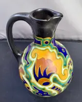 Mooi gevormde keramieken kruik met handbeschilderde decoratie in felle kleuren.