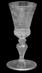 Een zeer mooie en zeldzame zgn ‘Hansje in de kelder’, gegraveerd glas. Vermoedelijk midden 18e eeuw (c.a. 1750). Gravering met een zwangere vrouw.