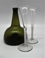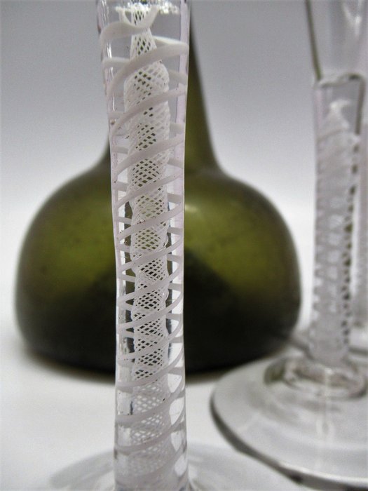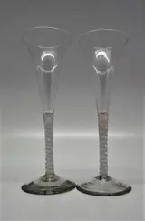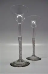 2 prachtig in nieuwstaat verkerende opaak twist champagne glazen, in nieuwstaat verkerend. De glazen zijn ongeveer 265 oud, hebben een trompetvormige kom, een rechte steel met een opaak netwerkspiraal en daar omheen twee opaak witten slingers draaiend rondom het netwerkspiraal. De voetvan de glazen is conisch met ieder een afgeknepen pontil. Graag verwijs ik u door naar de foto's, welke mede onderdeel van de beschrijving zijn