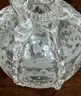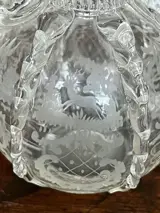 Zeer fraaie karaf / fles met stop, gemaakt om aan een bruidspaar te schenken. Jachttaferelen en bloemmotieven zijn ingegraveerd.