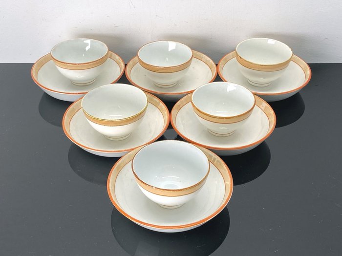 Zeer mooi antiek keramiek servies vermoedelijk uit het midden tot einde van de 19de eeuw. Het servies bestaat uit een koffiepot, 6 kleine kommetjes met bijpassende schoteltjes en een suikerpot met deksel. Alle delen zijn zeer eenvoudig gedecoreerd met oranje lijnen en boorden met een licht iriserend glazuur. De koffiepot meet 26cm in de hoogte en 20cm van tuit tot handvat; de kopjes meten 4,5cm in de hoogte en 7,5cm in diameter en de schoteltjes hebben een diameter van 13cm en zijn ongeveer 3cm hoog. De suikerpot is 15cm hoog en heeft een diameter van 9cm aan de rand van de pot. Alle delen zijn in originele en gepoetste staat met sporen van ouderdom en gebruik. Totaalgewicht ongeveer 2,7kg.