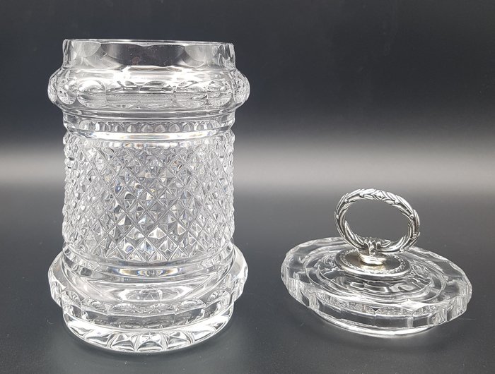 De pot heeft een fijn kristal vakmanschap met elegante facetten en gravures op de bodem, perfect intact en met een buitengewone glans en transparantie.