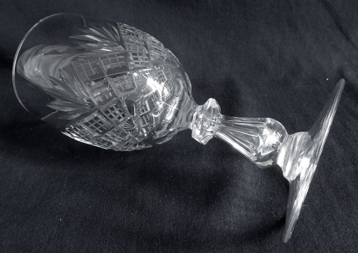 Onze glazen, oude producties van voor 1936 (vermoedelijk eind 19e eeuw), dragen niet de signatuur van de kristalfabriek, en zijn niet vertegenwoordigd in de catalogi die wij tot onze beschikking hebben, maar het model is een compilatie van meerdere bekende modellen. : Douai voor het gesneden patroon, Libourne voor de voet.