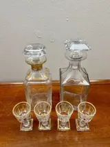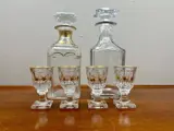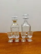 Lot van Baccarat glaswerk bestaande uit een likeurfles/whiskykaraf in Napoleon III France-kristal inclusief vier glaasjes uit eind 19e eeuw en een Harcourt model karaf. De stukken zijn niet gesigneerd (want geproduceerd voor ruim voor 1936). De likeurset is handbeschilderd met gestileerde bloemen. Mogelijk ooit onderdeel geweest van een likeurkelder.