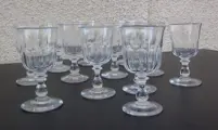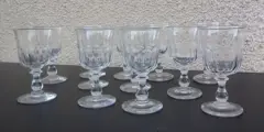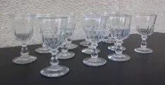 Schitterende serie van 12 kristallen wijnglazen, gondelmodel met platte ribben aanwezig in de Baccarat catalogus van 1916