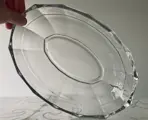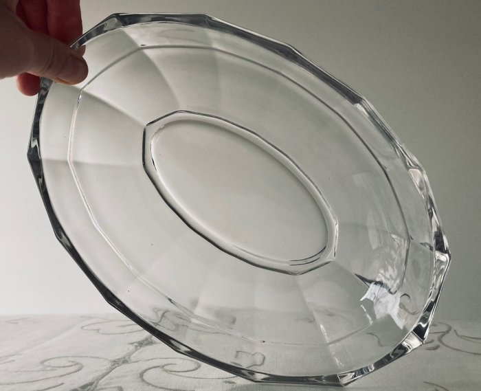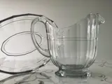 Uit de Luxval reeks Éclat (cf. catalogus van 1935), ontworpen door Charles Graffart en René Delvenne voor Val Saint Lambert, in helder persglas / kristalglas een schenkkan (c. 16 cm hoog, 9,5 breed, en 21 lang ter hoogte van het handvat; 768 gr zwaar) + ovalen schaal (c. 6 cm hoog, 26 cm lang, 18 cm breed; 853 gr zwaar). Beide stukken zijn in excellente, perfect gave staat.