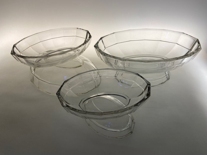 De schalen zijn gemaakt in helder persglas waar een deeltje aan kristal is toegevoegd om een mooiere glans te bekomen, dit gebeurde vaak bij het art deco glaswerk.