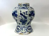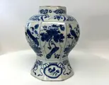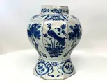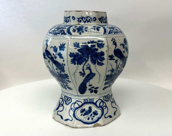Antieke 18e eeuwse Delftse vaas versierd met planten en vogels.