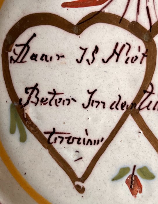 Polychroom bord met spreuk in twee hartjes: Daar is Niet Beter in den Trouw, Als liefde tussen Man en Vrouw".