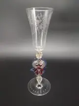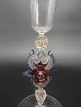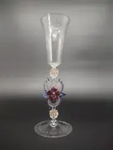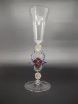 fraai en rijkelijke gedecoreerd glas met gegraveerde bloemen op de kelk en een sierlijke stam met twee rozen en andere ornamenten.