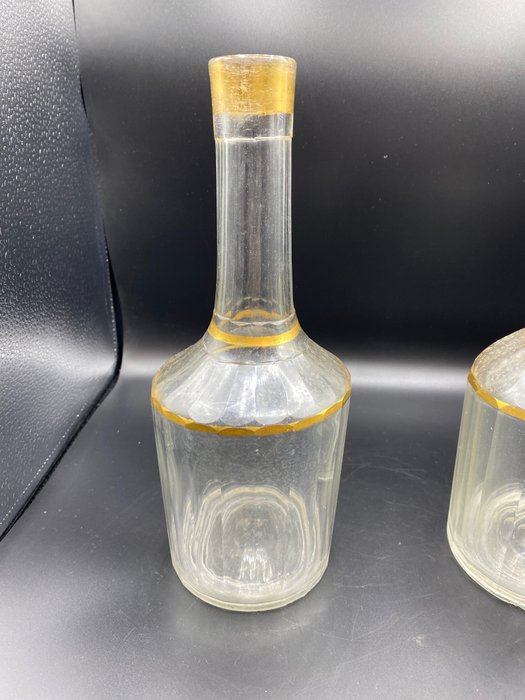 Drie glazen flesjes met vergulding, twee met een hoogte van 28 cm en een met een hoogte van 20 cm,