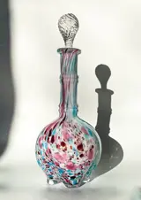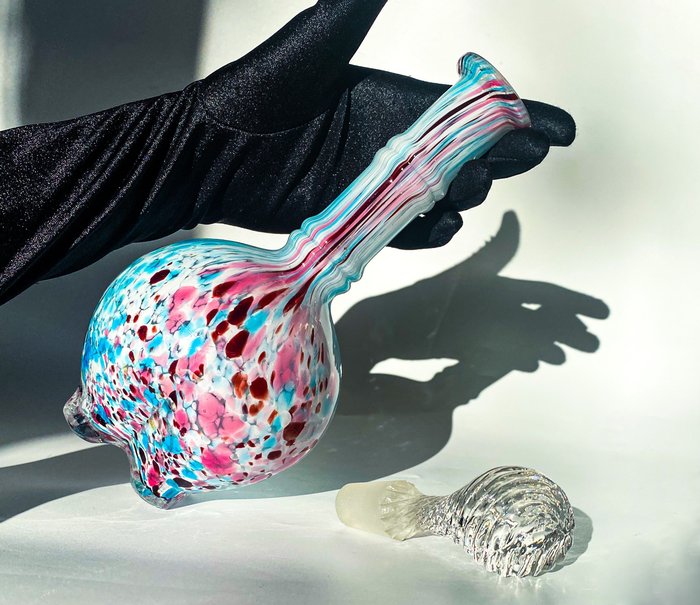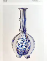 Prachtige karaf in "Algerijns" model van Legras & Cie. met zijn vier holle pootjes & geringde hals. Karaf in bonte decoratie. Dit type glaswerk genaamd "Clichy" In 1889 worden deze vazen gepresenteerd als nieuwe vormen en kleuren (honderd referenties vervaardigd in elk van de kleuren weergegeven in een schakering van ten minste drie kleuren en vaak insluitsels van "aventurijn" (kristallisatie van koper en ijzer).