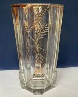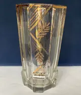 Een Art Deco vaas met gefacetteerde zijkanten en een geometrisch gouddecor in de Weense Secessionistische stijl van Joseph Hoffmann. Typerend voor glas geproduceerd door Moser, Meyr's Neffe en Johann Oertel & Co. rond 1930. De motieven van het decor zijn in de stijl van Karl Palda.
