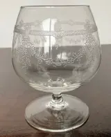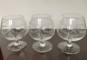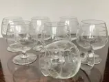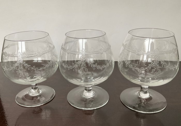 7 Nederlandse mondgeblazen glazen, gedecoreerd met barokke slingers en bloemen, voor het proeven van geweldige likeuren, Armagnac, Cognac, Calvados en andere kostbare dranken. De kleine gebreken die u kunt vinden, garanderen dat het product volledig handgemaakt is.