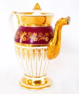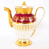 Grote theekan in Parijs porselein versterkt met fijn goud, eivormige vorm op een wijnrood getinte achtergrond. Het is versierd met palmetten en takmotieven. Mooie vergulding in mat en glans. Begin 19e eeuw - Charles X restauratie, rond 1830.