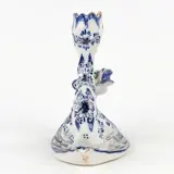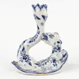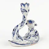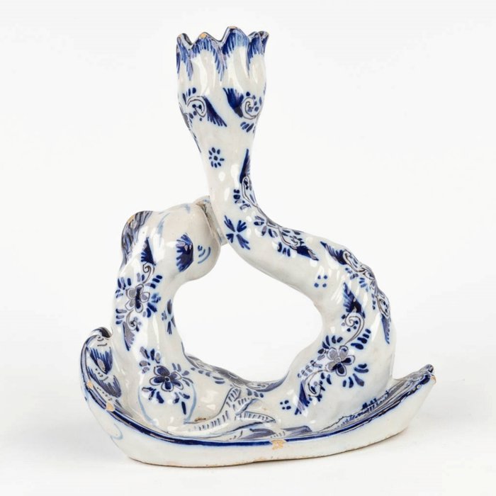 Een prachtige antieke kandelaar in Noord-Franse (wellicht Desvres) blauw-wit porselein. De kandelaar beeldt een mythologisch draakwezen uit waarvan de staart dient als kaarshouder en de vleugels de kandelaar ondersteunen. Bijzonder mooi floraal decor. Vroeg 19de-eeuws, onderaan gemarkeerd met1552 en een symbool.
