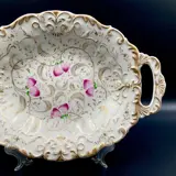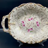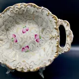 Bloemen fuchsia decoratie in het midden over een ivoorwit porselein, rocaille-motieven, verguld met de hand beschilderd. Veelzijdig stuk omdat het een kostbaar pronkstuk of kastdisplay kan zijn, dit is een zeldzaam verzamelobject uit het midden van de 19e eeuw.