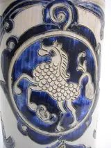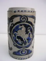 Mooie bierpul met ingekerfde decoratie van een steigerend paard. Met cobalt ingekleurd.