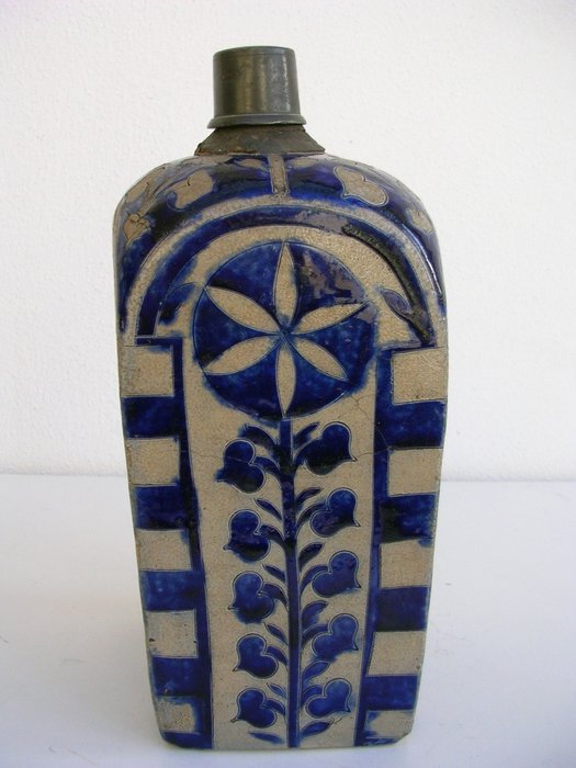 Zeldzame Vierkantfles met Scrafitto Decoratie Westerwald 18e eeuw