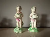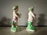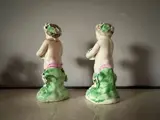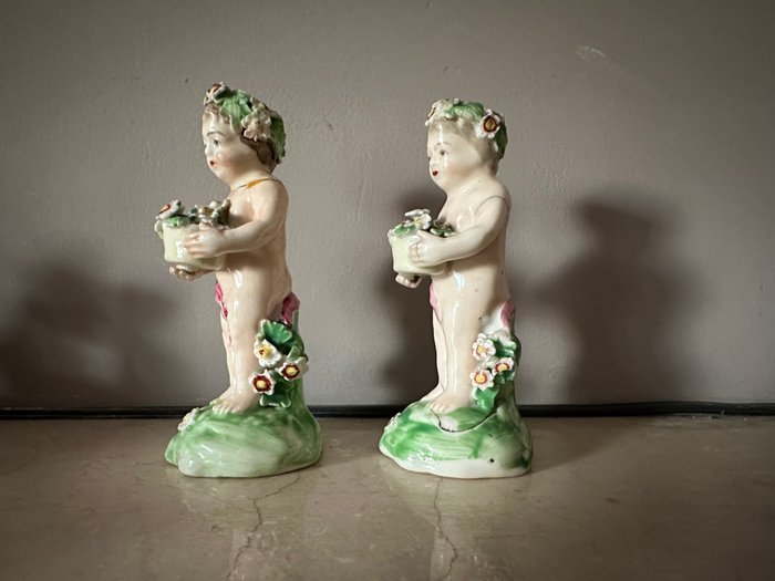 Twee onderwerpen in 18e-eeuws Engels porselein die cupido's voorstellen die gebloemde manden in hun handen houden (allegorie van de lente). Ze rusten op een groen beglaasd terras (gras) en leunen op een bloeiende struik. Bijna naakt dragen ze een roze laken op de heupen en een krans van bladeren en bloemen in hun haar. Zeker een productie van de Manufacture of Bow of Derby (Engeland), opgericht in 1744 en gesloten in 1776. Beschadigd en vervolgens ruw gerestaureerd (zie foto's). Zou een hervatting van de restauratie vereisen.