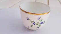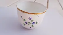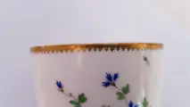 Oude Parijse porseleinen pot rond 1785, gedecoreerd met korenbloemen in de hals versierd met een fries van gouden wolfstanden.Het merkteken onder de AG-basis in cursieve letters is dat van de Parijse fabriek aan de rue de Bondy, ook wel bekend als de rue du Temple, van de hertog van Angoulême, en van DIHL en GUENARD opgericht in 1781 en gesloten in 1828. De A van Angoulême en de G van Guénard. Let op enkele kleine krasjes op de hiel. Uitstekende staat gezien de leeftijd.