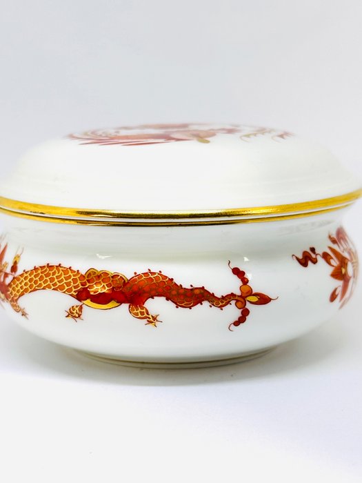 Meissen doosje in handbeschilderd porselein model Red Ming Dragon in oranje tinten met gouden rand. Gemerkt met twee zwaarden uit de Meissen fabriek. Duitsland.
