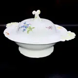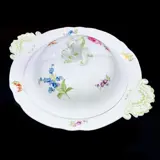 Elektrisch blauwe vergeet-mij-nietjes, grote roze roos met knop, fuchsia en andere bloemen verspreid over schaal en deksel, samen met fantastische lichtgroene grashandvatten en gedraaide knop, maken de schoonheid ervan compleet.