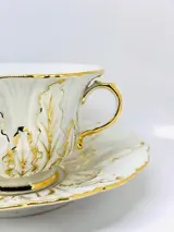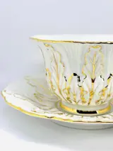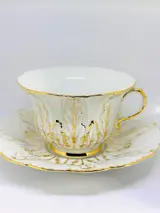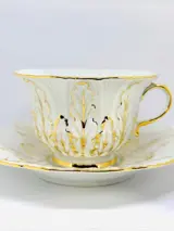 MEISSEN Theekop en schotel van wit porselein met vergulde reliëfdecoratie. Merkteken met gekruiste zwaarden in blauw.