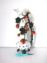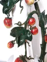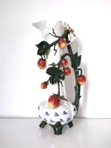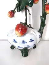 Zeer mooie originele vaas met handvat in de vorm van een aardbeiplant met aardbeien in reliëf gevormd en met de hand beschilderd. Uiterst zeldzaam model met vier pootjes onder de voet en een dikbuikige en geribbelde vorm.