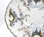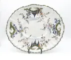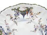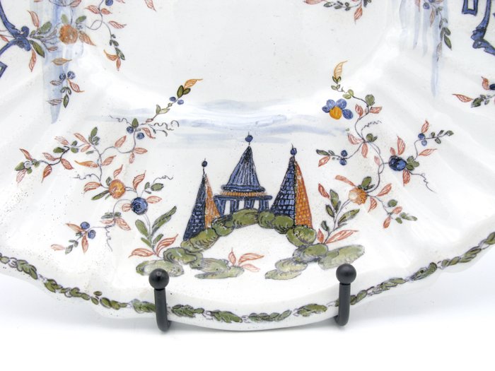 Ovaalvormige polychrome majolica met een mixtilineaire rand. Platte basis. Florale kettingrand. "Ponticello" decoratie met pagodes en piramides tussen bloeiende wijnranken. De Perzisch geïnspireerde "Ponticello"-decoratie is de bekendste van de traditionele achttiende-eeuwse decoraties van de Antonibon-fabriek.