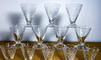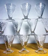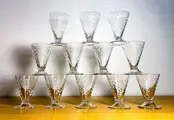 Mooie set van 12 kristallen glazen. Klaar om te serveren voor wijn: porto/kers/sake & voor likeur. Franse productie. Perfecte staat. Lichtgewicht mondgeblazen kristal in conische vorm en geometrisch mat design.