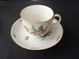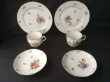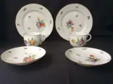 2 kop en schotels met bijbehorende ontbijt/taartborden in de uitvoering ' Blumenmalerei / Korb / decor 865 / Goldband'