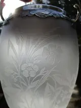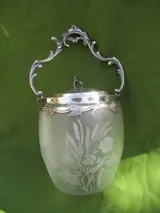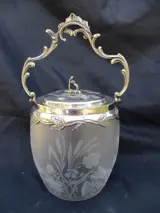 Oude koekjesemmer uit het einde van de 19e eeuw. Frame in rotstuinstijl opnieuw bekeken in zilverkleurig metaal met een versiering van gesneden bladeren voor de omsnoering en grote gestempelde rozen voor het deksel. De satijnen kristallen pot met herhaalde versiering van Art Nouveau biezen in zure gravure, meer waarschijnlijk in de stijl van de producties van de Saint-Louis-fabriek, maar ook van Baccarat. Geen markering of handtekening of zelfs stempel op dit object. In goede staat, geen breuk, barst of verlies of restauratie. Hoogte zonder handvat 17cm, hoogte zonder deksel 14cm. Diameter hoogstens uitlopend 13cm, dekseldiameter 10,5cm. Gewicht bijna 0,7 kg.