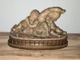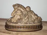 Prachtige Italiaanse keramieken beeldengroep van jonge Bacchus, putto en satyr. Gesigneerd en voorzien van serienummer.