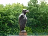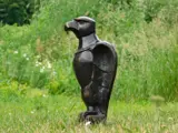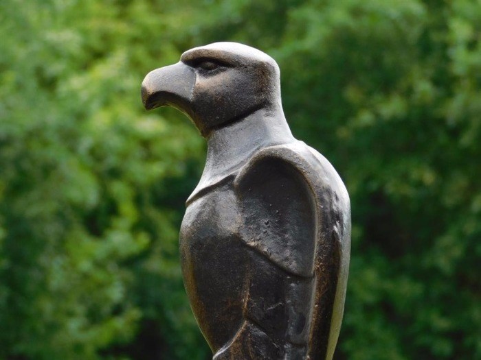 Prachtig beeld van een adelaar op houten voet, gemaakt van antiek ijzer.
