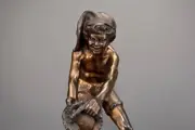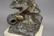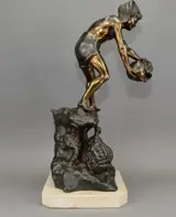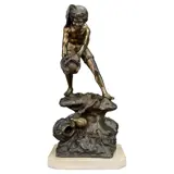 Een grote indrukwekkende oude figuur van een vissersjongen die op rotsen staat omringd door zeedieren. Spelter gegoten en staand op een marmeren voet, circa 1950 te dateren.