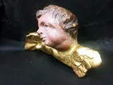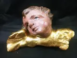 Een prachtig beeld van een engelenkop gemaakt van hout, de resten van een antieke polychroom uit de 18e eeuw, de staat weergegeven op de foto's die veel details laten zien en deel uitmaken van de beschrijving.