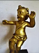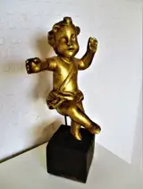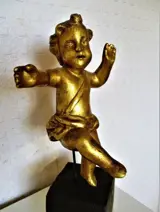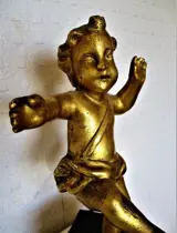 Een prachtige en hemelse Italiaanse gesneden verguld houten sculptuur/figuur die een Putti voorstelt met een verre blik. Het stuk is voor weergavedoeleinden op een stuk oud hout gemonteerd, waardoor de totale hoogte ongeveer 35 cm bedraagt (inclusief de standaard).