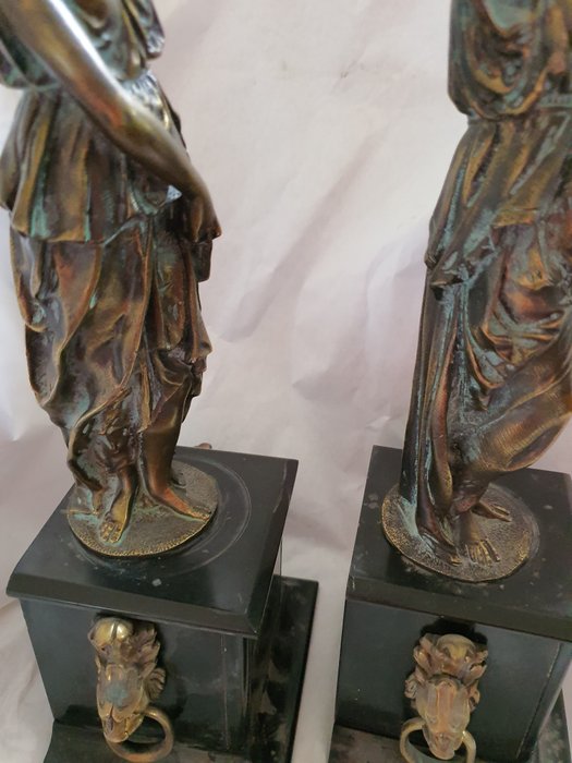 Een paar bronzen kandelaars met klassieke vrouwenfiguren en marmeren voet.