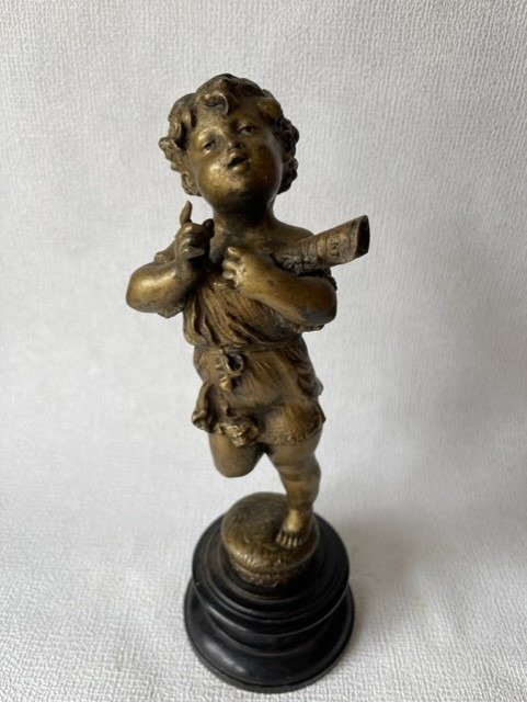 Beeld, putto op gezwarte sokkel - Hout, Zinklegering - Eind 19e eeuw