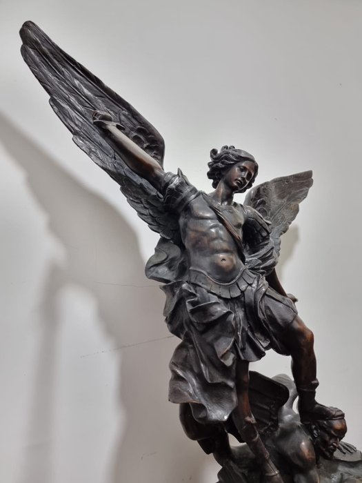 Monumentaal bronzen beeld, verloren was gieten, voorstellende de aartsengel Michaël tijdens het doden van Lucifer.