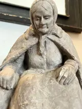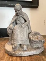 Beeld, vrouw met mandje eieren, gesigneerd F Trinque - gips mengsel - Eind 19e eeuw