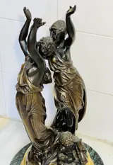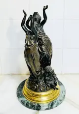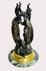 Groot sculptuur van muzen met op de voet cupido met het symbool van de tijd en een hond als symbolen van de gouden jeugd. Het is een beeld in Claude Michel stijl, Clodion gemaakt van brons met een mooie gouden patina op de details en de marmeren voet. Het is in goede staat met het ontbreken van een fakkelvlam zoals te zien is op de foto's. Sculptuur uit een privécollectie.