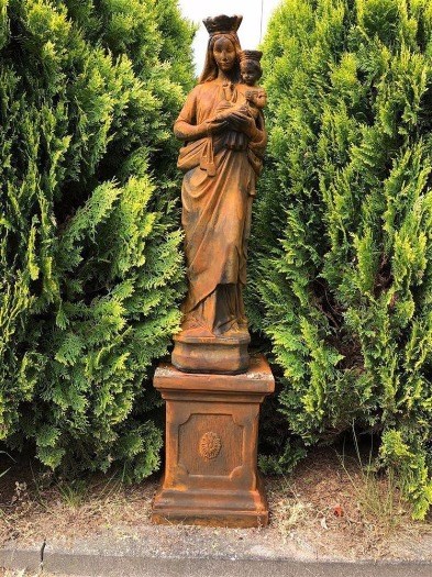 Madonna met Kind, Mary sculptuur, devotionele Maria vol steen op sokkel in oxide!!
