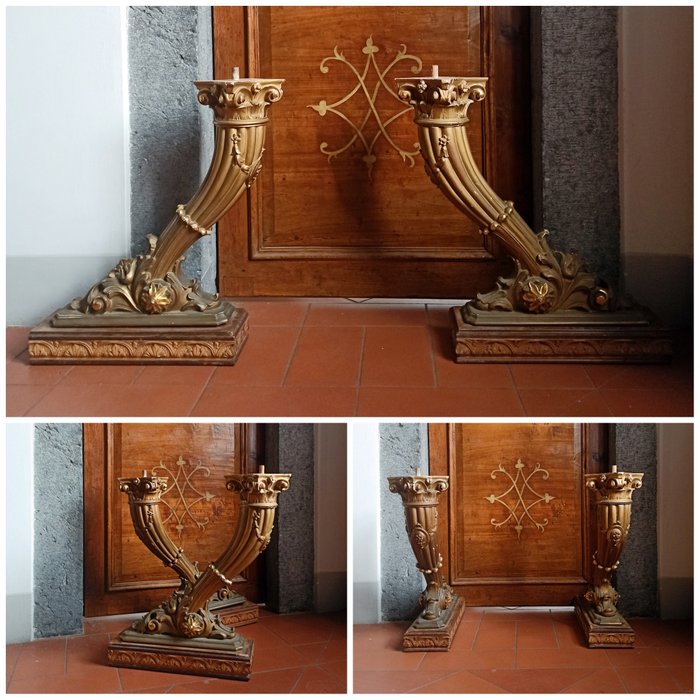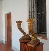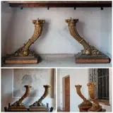 Paar grote houten hoorn des overvloeds, oorspronkelijk onderdeel van een meubelstuk. Het waren waarschijnlijk de poten van een console