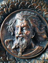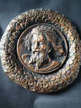 Mooie reliëf en geciseleerde koperen set om aan de muur te hangen. Afgebeeld van een Spaanse renaissanceheer. Het heeft een mooie patina van ouderdom. origineel snoer