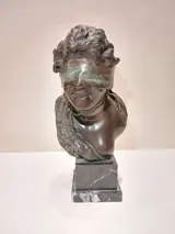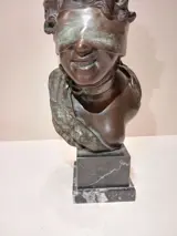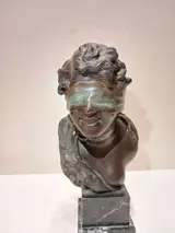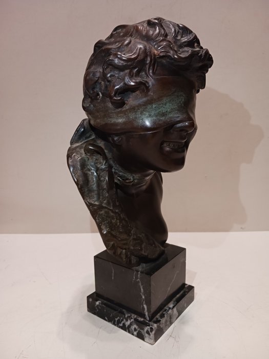 Naar een model van de beeldhouwer Tommaso Campajola, een actieve beeldhouwer uit de vroege jaren 1900, een sculptuur van de "Geblinddoekte Godin". Gemaakt in brons met het verloren wassysteem en rustend op een geaderde zwart marmeren voet, dit is recenter dan het verloren origineel. Uitstekende patina en afwerking, zie foto's, minimale ouderdomssporen... de groene adering van het brons is prachtig.