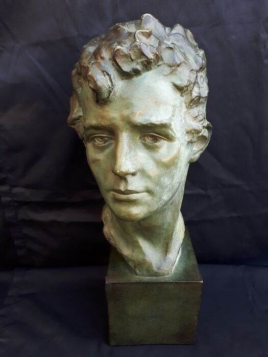 Hoofd jonge man op ware grote in brons gepatineerd terracotta,sculptuur van beeldend kunstenaar Victor Demanet (3 Februari 1895 – 7 Februari 1964), periode ca. 1930.