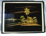 Voorstelling: Een paalwoning onder een palmboom gelegen aan het water.