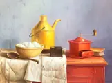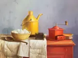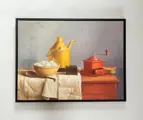 Stilleven met gele kan, koffiemolen en schaal met eieren gesigneerd met A. vd Ven geïnspireerd op Henk Helmantel in luxe zwarte baklijst.